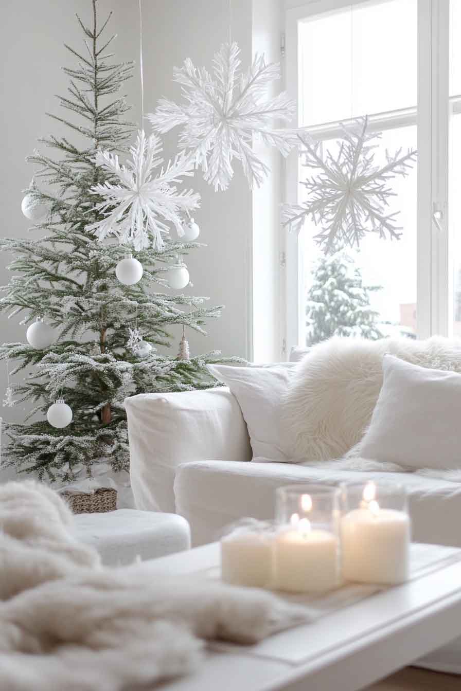 White furniture with light wood accents creates an airy foundation. White candles in simple holders provide soft light. The minimal approach emphasizes peace, simplicity, and the beauty of winter.