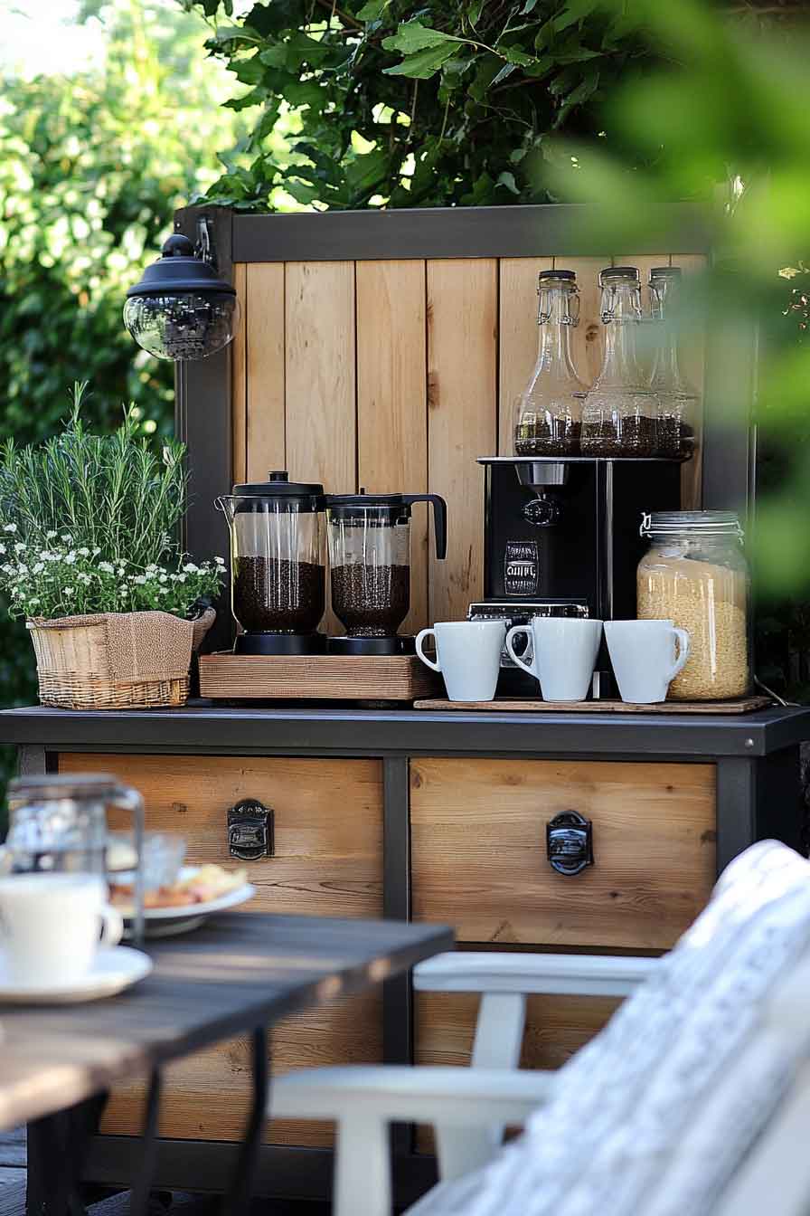 An outdoor coffee bar is perfect for weekend mornings or entertaining guests. Add comfortable seating nearby and enjoy your coffee in the fresh air.
