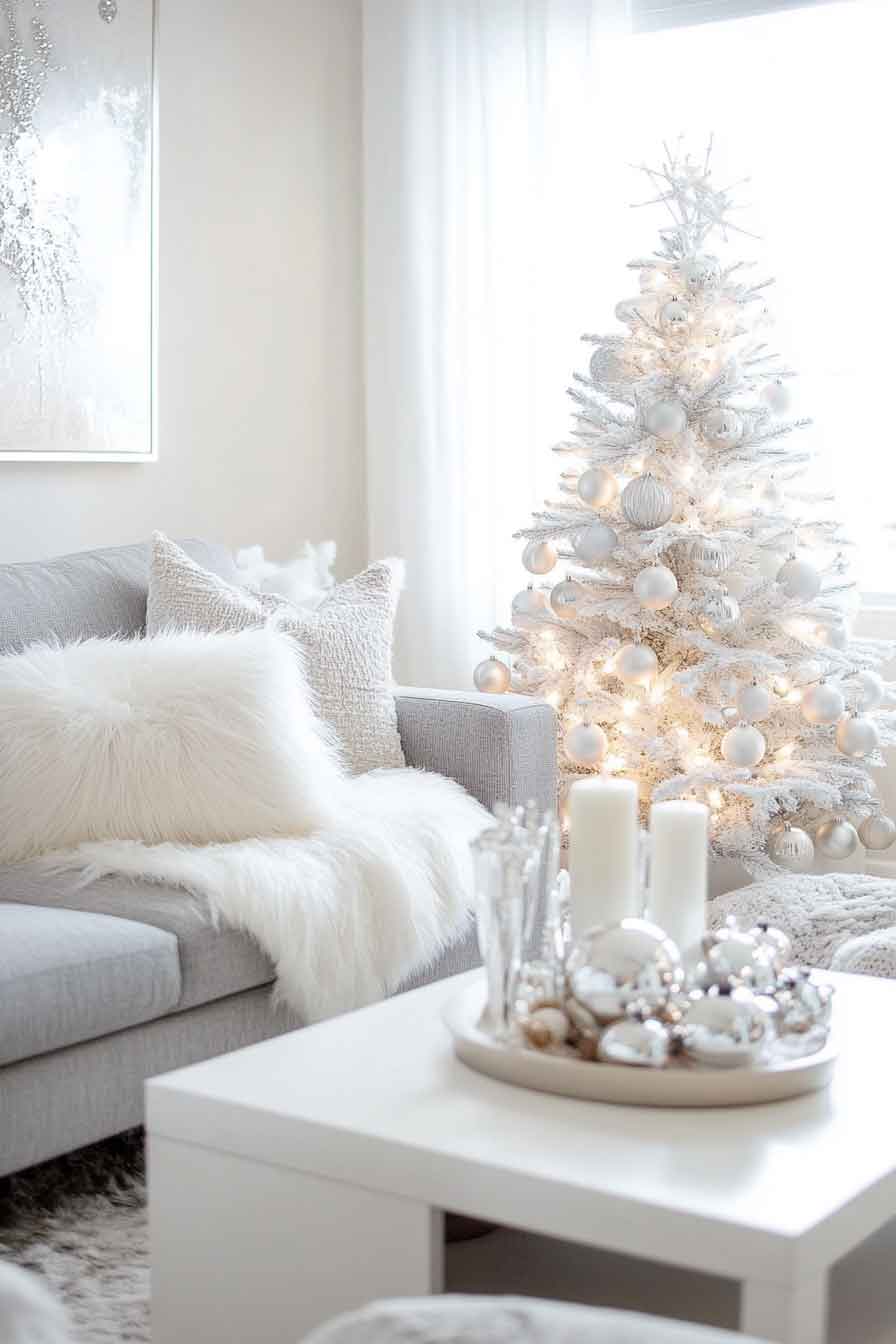 This contemporary space features a white Christmas tree decorated with silver ornaments and clear glass baubles. The tree sits in a white ceramic pot, maintaining the clean, modern aesthetic.