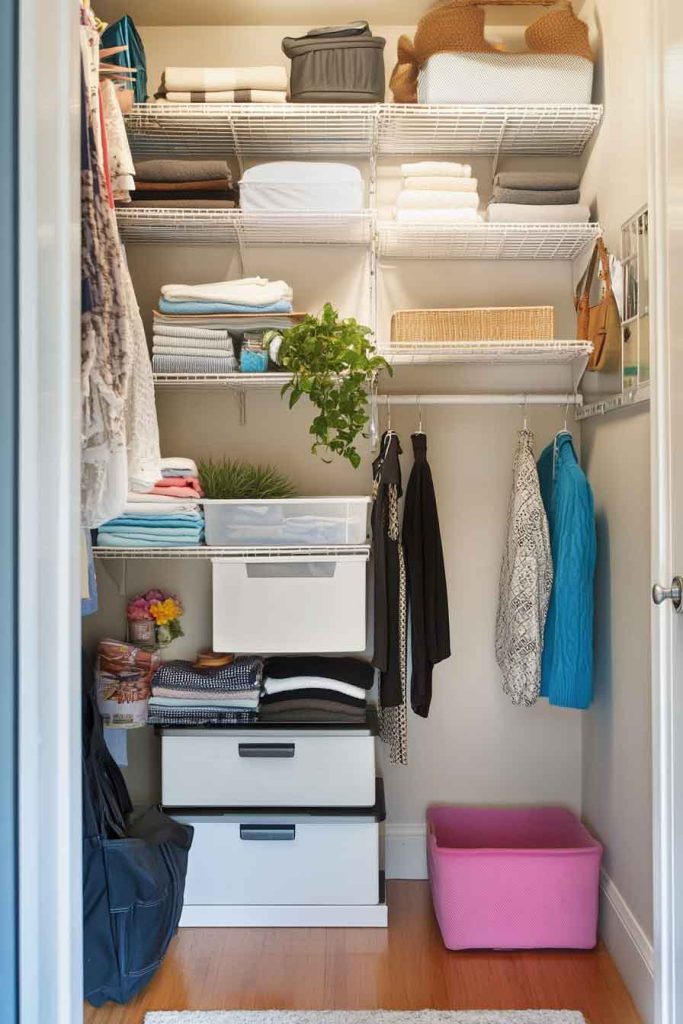 Baskets and bins are essential for keeping small items organized and out of sight. Use them in your closet for accessories, on shelves for supplies, or under your desk for extra storage.