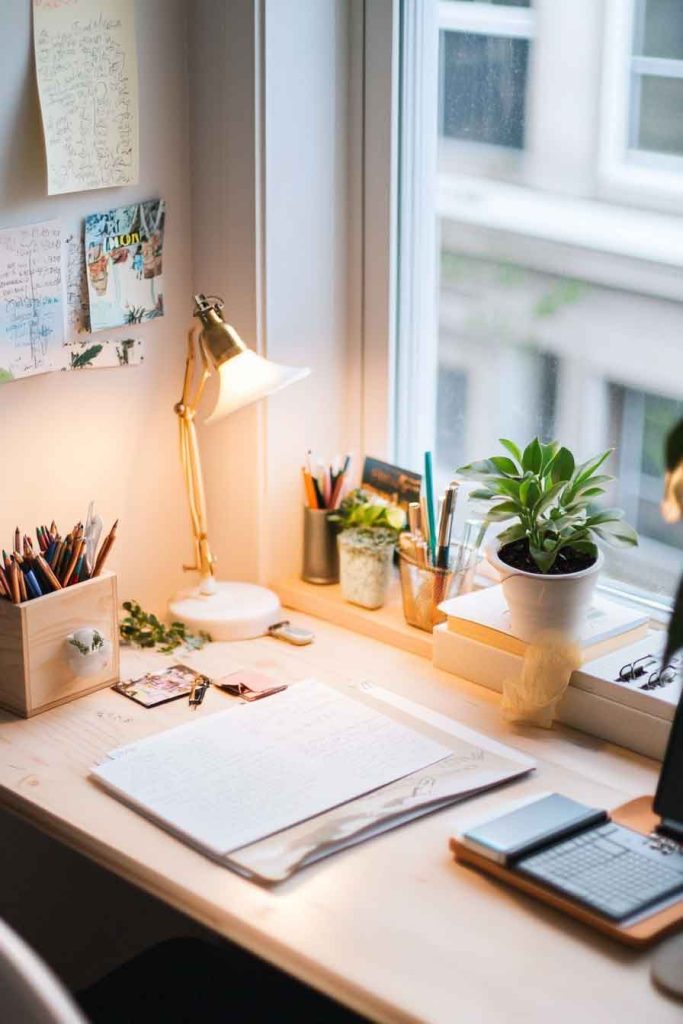 Your desk is your study headquarters, so make it functional and inspiring. Add a desk lamp with good lighting for late-night study sessions. Use desk organizers, pen holders, and file folders to keep supplies tidy and accessible.