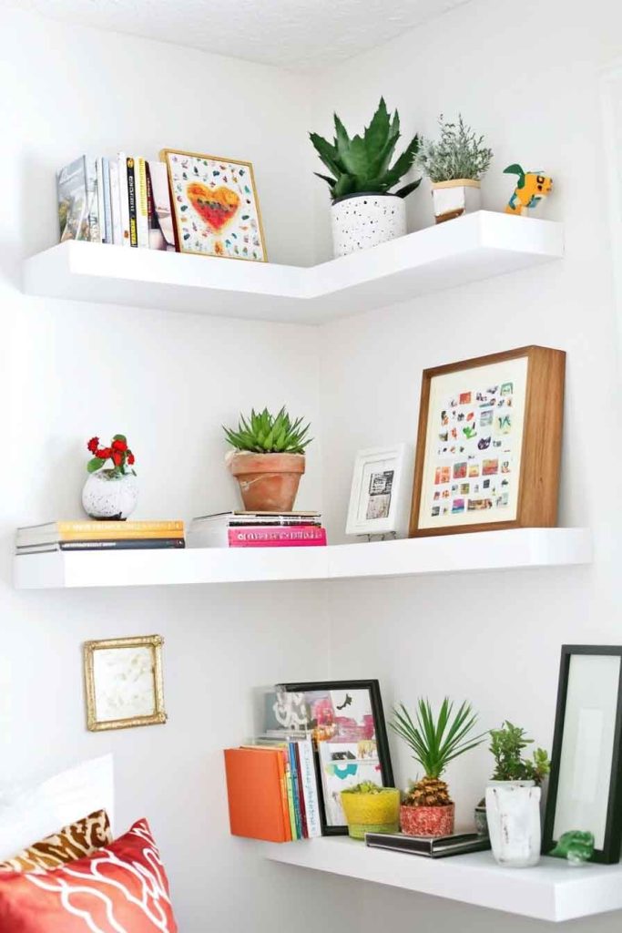 Style shelves with a mix of functional and decorative items – books, small plants, framed photos, or trinkets that make you smile.