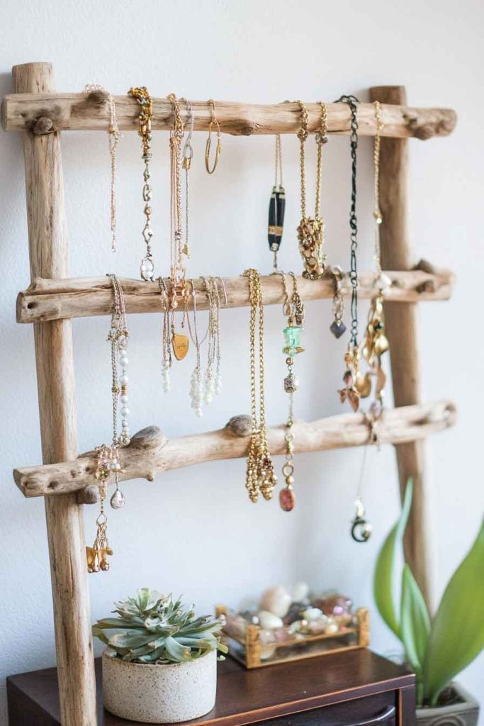 Instead of tangling in a drawer, display your jewelry as decor. Use a small jewelry stand, hang necklaces from decorative hooks, or create a DIY jewelry display using a small ladder or branch.
