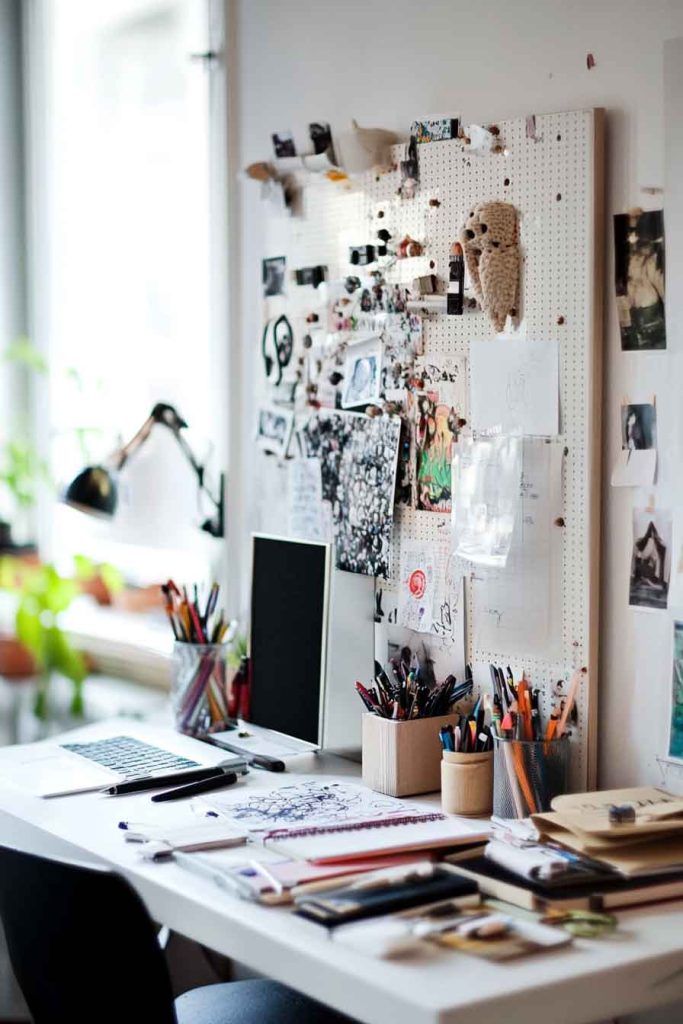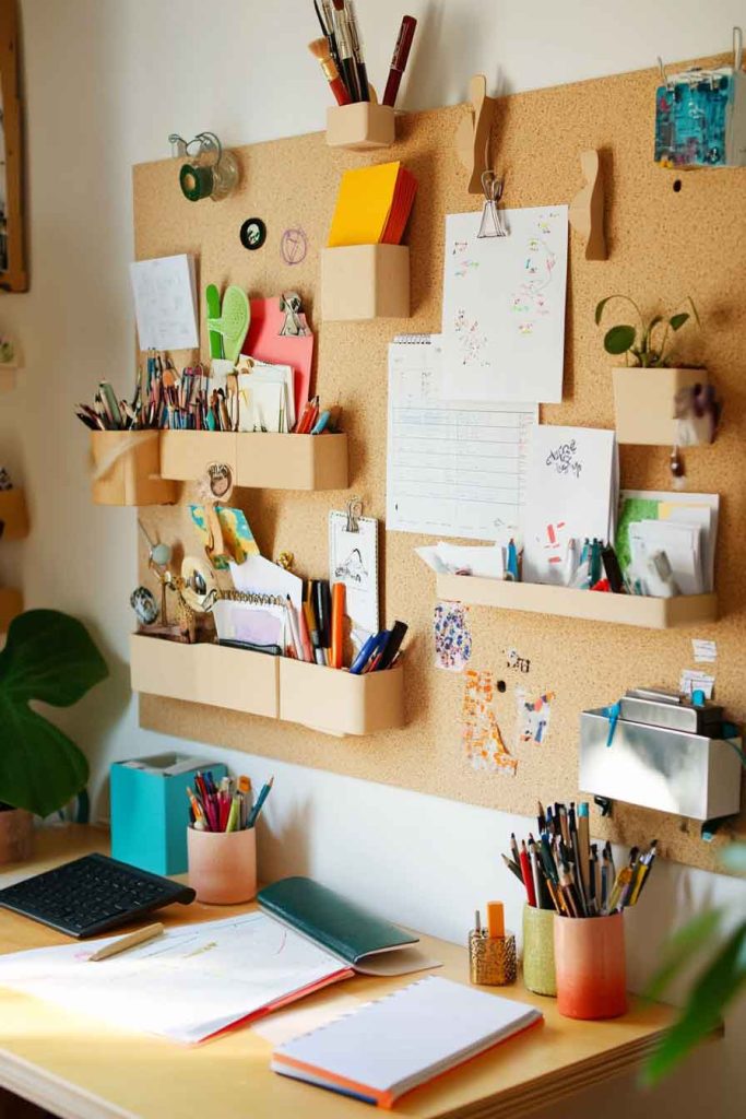 A corkboard or pegboard provides both function and style. Pin important papers, photos, and reminders to a corkboard, or hang frequently used items from a pegboard.