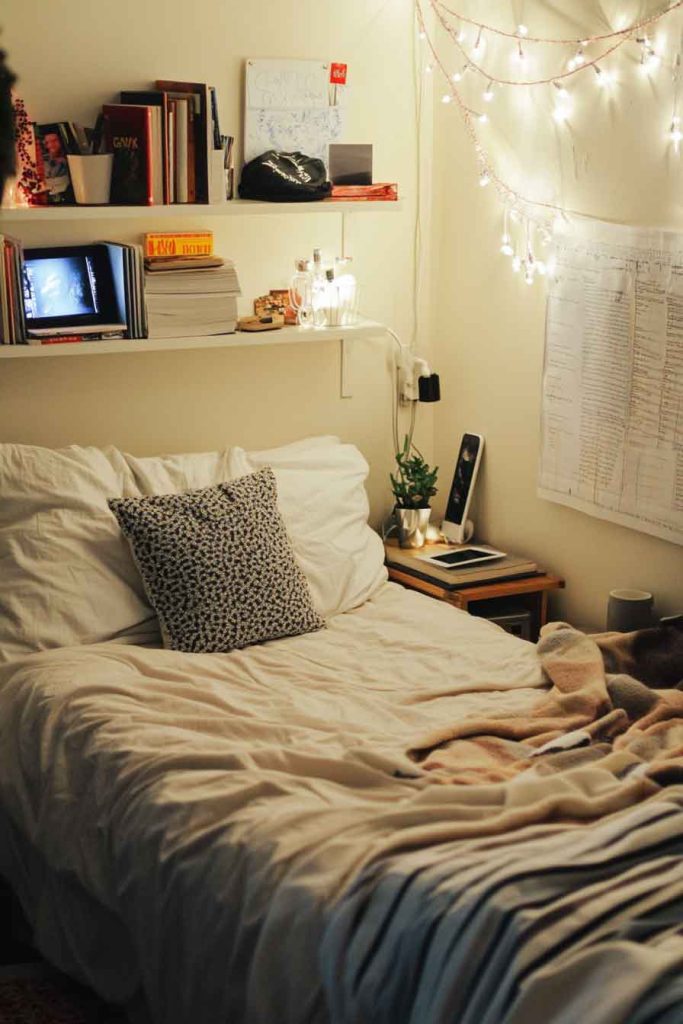 String lights are a dorm room essential. They create a warm, cozy atmosphere that makes harsh overhead lighting unnecessary. Hang them around your bed frame, along the walls, or across the ceiling to add a soft glow to your room.