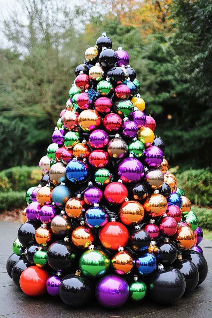 The abundance of ornaments creates maximum color and visual interest. This design shows that tire Christmas trees can look just as decorated and festive as traditional trees.